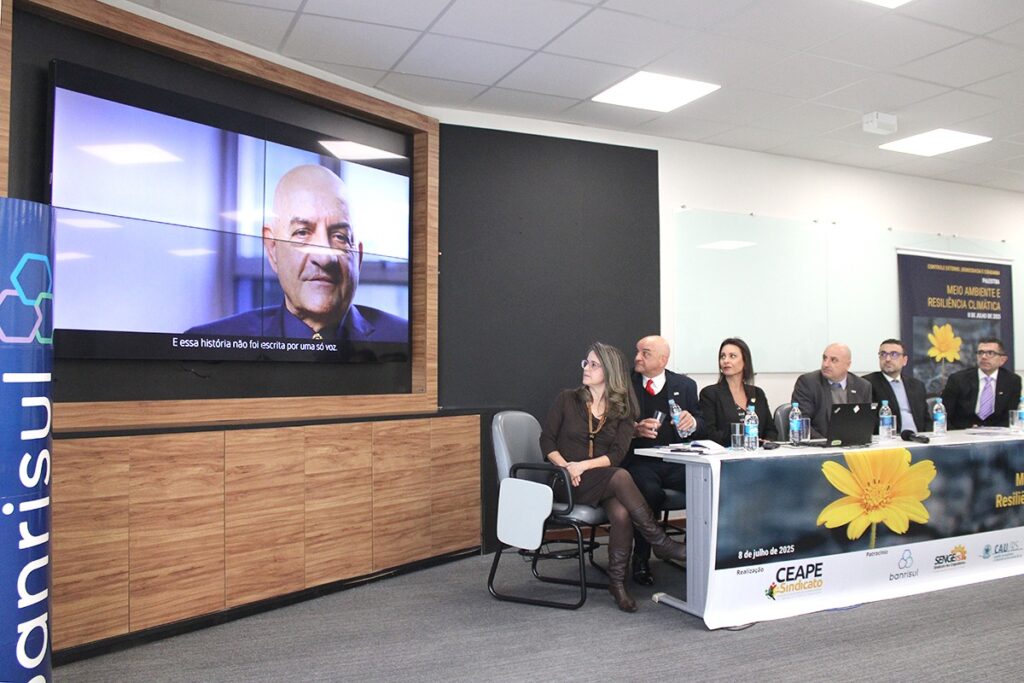A palestra “Meio Ambiente e Resiliência Climática”, do geólogo e coordenador do Atlas Ambiental de Porto Alegre, Rualdo Menegat, marcou o lançamento da 13ª Edição da Revista Achados de Auditoria do CEAPE-Sindicato de Auditores de Controle Externo do RS, nesta terça-feira (8/7). O evento Controle Externo, Democracia e Cidadania ocorreu no Auditório da Escola Francisco Juruena, do TCE-RS (Rua Sete de Setembro, 388 – Centro Histórico) e marca os 40 anos de atividade do CEAPE-Sindicato, fundado em 25/06/1985 como Centro dos Inspetores de Controle Externo do TCE/RS – CITC/RS.