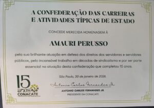 Presidente da FENASTC recebeu, em São Paulo, dia 30 de janeiro de 2026, homenagem da CONACATE (Confederação de Carreiras e